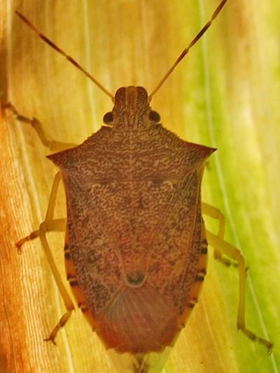 Podisus maculiventris is a large predatory stink bug, the adults of which are approximately 11–13 mm long by 6.5–8 mm wide, with males usually being slightly smaller than females. The adults are brown in color, with two prominent thorn-like spines projecting to each side just behind the head (as pictured).